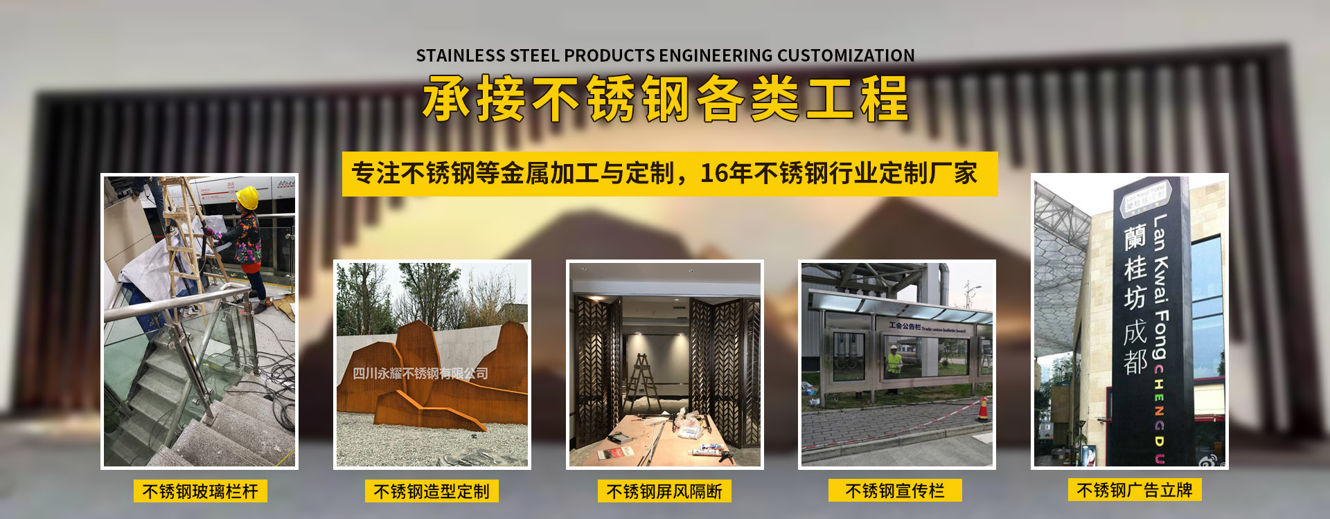 四川永耀不銹鋼有限公司是一家集開(kāi)發(fā)、設(shè)計(jì)、加工、制作、安裝、并承接各種不銹鋼工程為一體的綜合性企業(yè)。多年來(lái)一直在專(zhuān)注于不銹鋼等金屬的加工與研發(fā)。在客戶群體中贏得了良好的聲譽(yù),以專(zhuān)業(yè)專(zhuān)注的精神,致辭力于打造良好的產(chǎn)品和企業(yè)形象,對(duì)每一產(chǎn)品傾注全力,力爭(zhēng)每個(gè)細(xì)節(jié)精細(xì),確保產(chǎn)品具有優(yōu)越的性能,優(yōu)美的外觀及優(yōu)良的品質(zhì),使公司產(chǎn)品深受廣大用戶的親睞。 本公司主要業(yè)務(wù): 一、工程類(lèi) 承攬:酒店、銀行、商鋪、寫(xiě)字樓、公寓、城鐵、地鐵、公交、機(jī)關(guān)、 學(xué)校、廣場(chǎng)藝術(shù)雕塑、自動(dòng)門(mén)、旋轉(zhuǎn)門(mén)、廣告欄、公